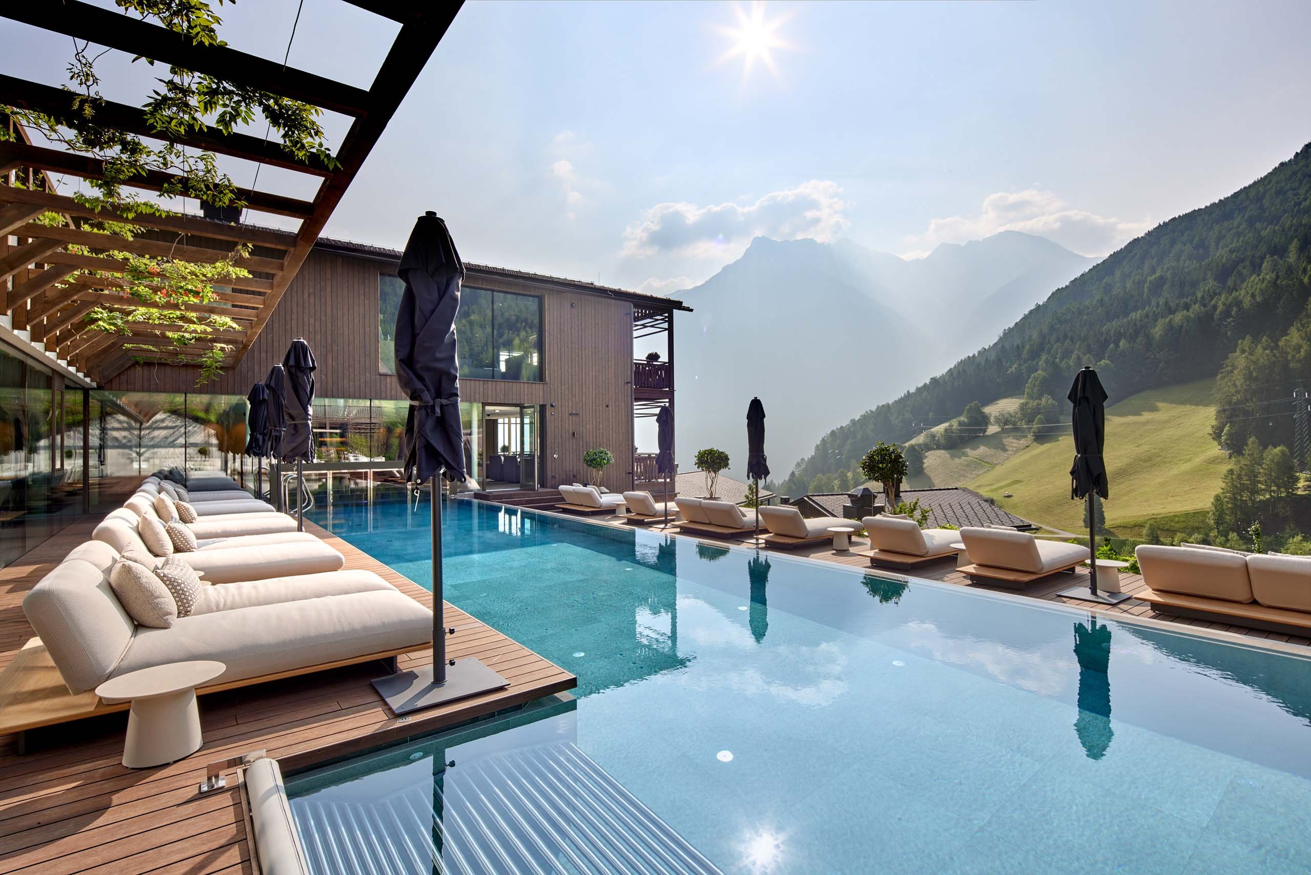 Zweistöckige Luxury-Villa (150 qm) für den besonderen Urlaub. Eigene Spa-Oase mit Panorama-Pool (12 x 4 m), finnischer Sauna, eigene Whirlwanne und herrlichen Lounge-Liegen zum Sonnenbaden und Genießen. Toplage in erster Reihe mit traumhaftem Blick ins Tal und auf die Berge.